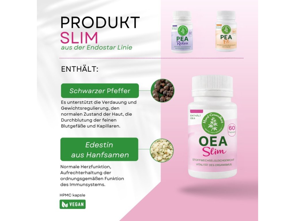 Der Hauptwirkstoff der SLIM Kapseln ist OEA (Oleoylethanolamid). Dabei handelt es sich um eine natürliche Substanz, die im Körper mit dem Sättigungsgefühl und der Regulierung der Nahrungsaufnahme zusammenhängt.