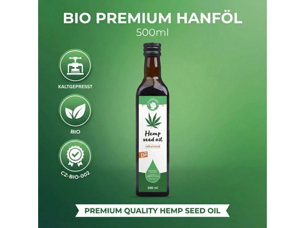 Hanfsamenöl wird aus Hanfsamen kalt und schonend gepresst und gilt als eines der besten Speiseöle. Es stammt aus ökologischer Landwirtschaft (CZ-BIO-002). Dieses Hanfsamenöl gewann den 2. Platz auf dem Cannafest 2016 für das beste Hanfsamenöl.